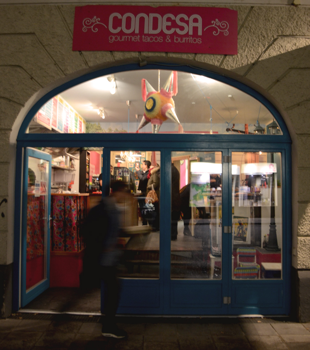 En un lateral de Münchner Freiheit, asoma tímido Condesa, restaurante mexicano especializado en tacos y burritos, ya sean para llevar o para comer en el mismo local.