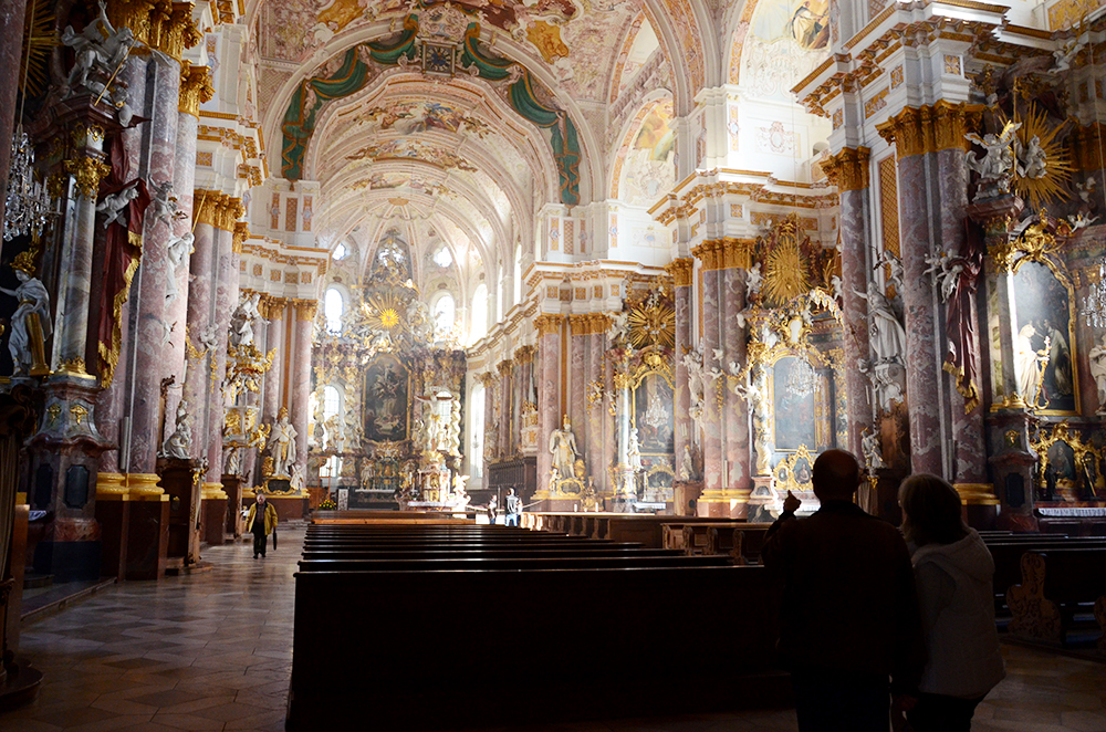 Es una iglesia de grandes dimensiones: 87 metros de largo, 32 de ancho y 43 de alto, con una torre de 70 metros. Entre otros, los altares y las pinturas están trabajadas por los hermanos Asam.