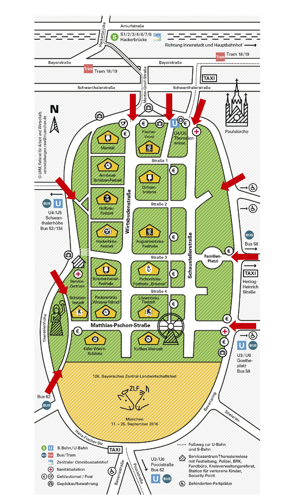 En total, este 2016 se han plantado 15 grandes carpas para el dispendio de cerveza, las catorce fijas, más una adicional (Festzelt Tradition) dentro del evento agrícola. A estas hay que sumarles otros 19 locales de menores dimensiones con permiso para servir cerveza. Son dos menos que en 2015. Así las cosas, el aforo se ha visto reducido de las 119 000 plazas de 2015, a 106 000.